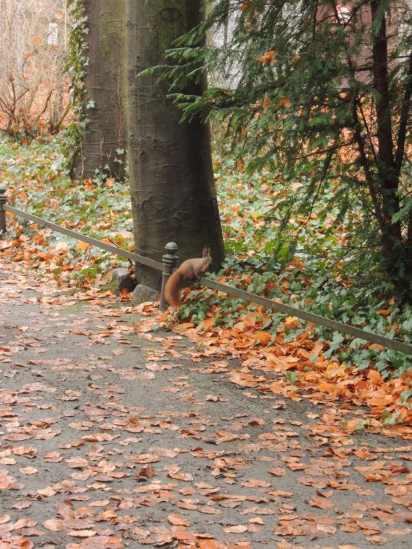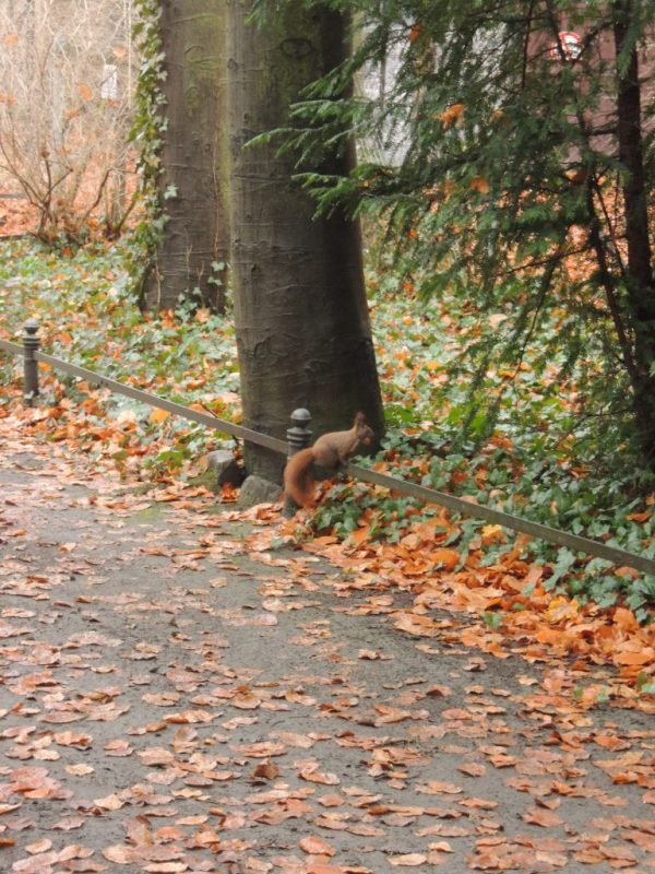 Während wir gerade dabei sind, die ersten Lebkuchen und Plätzchen für den Advent zu besorgen, hat auch dieses Eichhörnchen offensichtlich viel zu tun. Es trägt eine Eichel im Maul – Vorrat für den Winter. Vermutlich wird es den schmackhaften Fund irgendwo im Zehlendorfer Gemeindewäldchen vergraben, in einem von vielen Vorratslagern in „seinem“ Wald. Vielleicht findet das Eichhörnchen die Leckerei irgendwann mal wieder und kann sich den Bauch vollschlagen.
